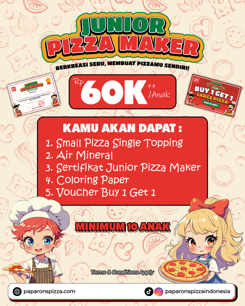 With only the amount of Rp.60.000,- Each participant can have a taste of their own Pizza creation and as a symbol of their participation in the Kitchen Tour & Junior Pizza Maker program. We will have Junior Pizza Maker Certificate handout to each of the participants.